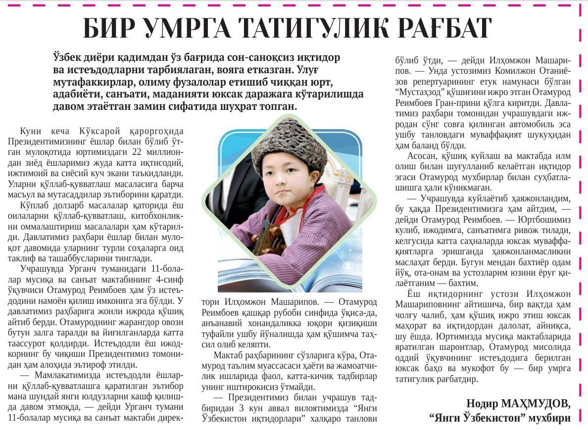 Otamurodning iste’dodi va sahnadagi chiqishi Prezidentimiz tomonidan alohida e’tirof etilib, avtomobil sovg‘a qilindi.